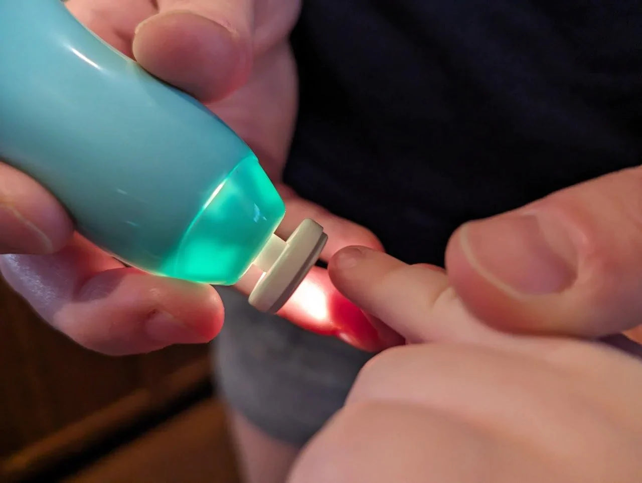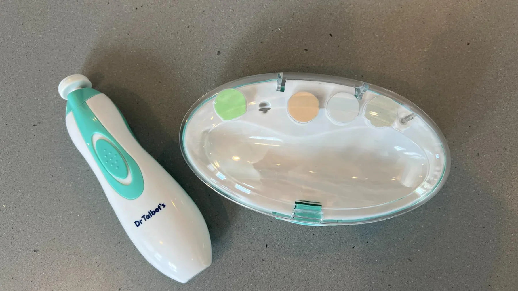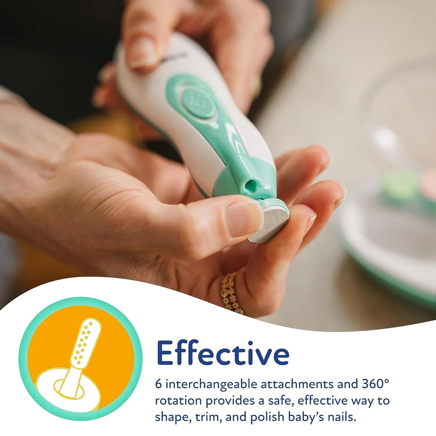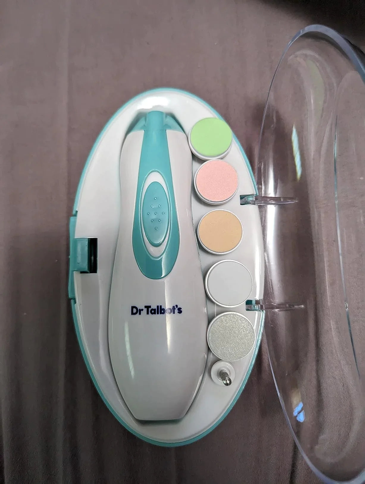 Keep your little one’s nails trimmed and tidy with Dr. Talbot’s Baby Nail Trimmer. The Baby Nail Trimmer gently shapes and smooths baby’s nails without clipping or cutting. The 8-piece set includes 6 interchangeable attachments that let parents choose the right tool for their needs. The Baby Nail Trimmer features attachments ideal for trimming children’s nails like the extra fine grinding head, as well as more robust attachments, such as the metal grinding head which is perfect for adult nails. The Baby Nail Trimmer has a quiet, 2-speed motor with smooth 360° rotation that won’t scare or disturb little ones. A built-in LED light makes it easy to see baby’s nails for safer trimming and shaping. A convenient storage case keeps all the pieces in one place, making it easy to take when travelling